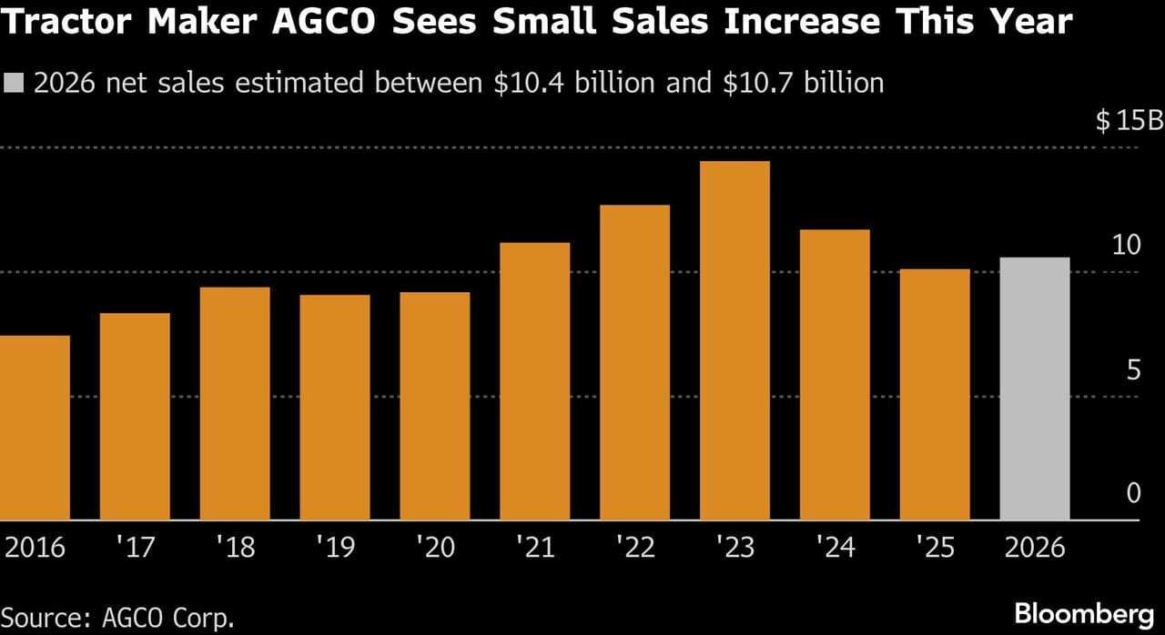 For 2026, net sales could rise to between $10.4 billion and $10.7 billion, AGCO said. That’s above a Bloomberg estimate of $10.07 billion and surpasses sales in the year ended Dec. 31 of $10.08 billion.