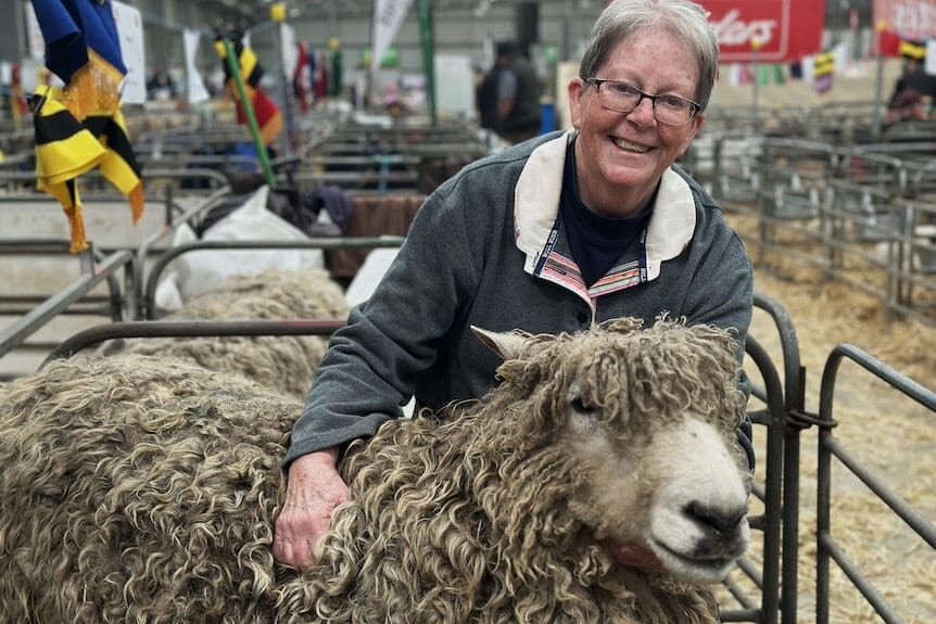 Rae Christie with a Lincoln ram, a breed that helped develop the Polwarth breed. (Landline: Tim Lee)