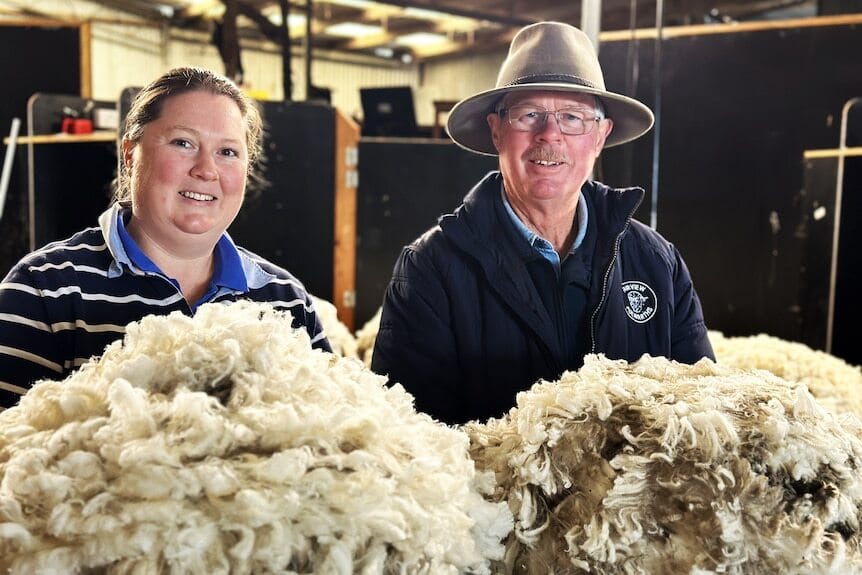 Samantha Potter and her father, Greg, with some of their finest Polwarth fleeces. (Landline: Tim Lee)